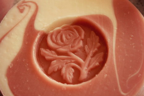 I've been working on a little custom soap, custom as in a little something special-it will still have my label on it,so it's not really a "private label." I' ve been working on putting together all the components of color, scent and well a little something special with the stamp. Rounds are so very nice in terms of how they fit in the hand, but they present certain challenges. Rounds are not conducive to adding botanicals on top,too much color work-swirling layers, or texture etc. I had a ball thinking about how I could convey "rose" with this soap. The scent involves Geranium, so it has a "rose" like note. I really should have waited 24 hours or so before stamping, but this is a prototype and I wanted to see the look come together-I stamped a bit early. Overall, I think I'm very happy with the outcome-I hope my customer will be too!